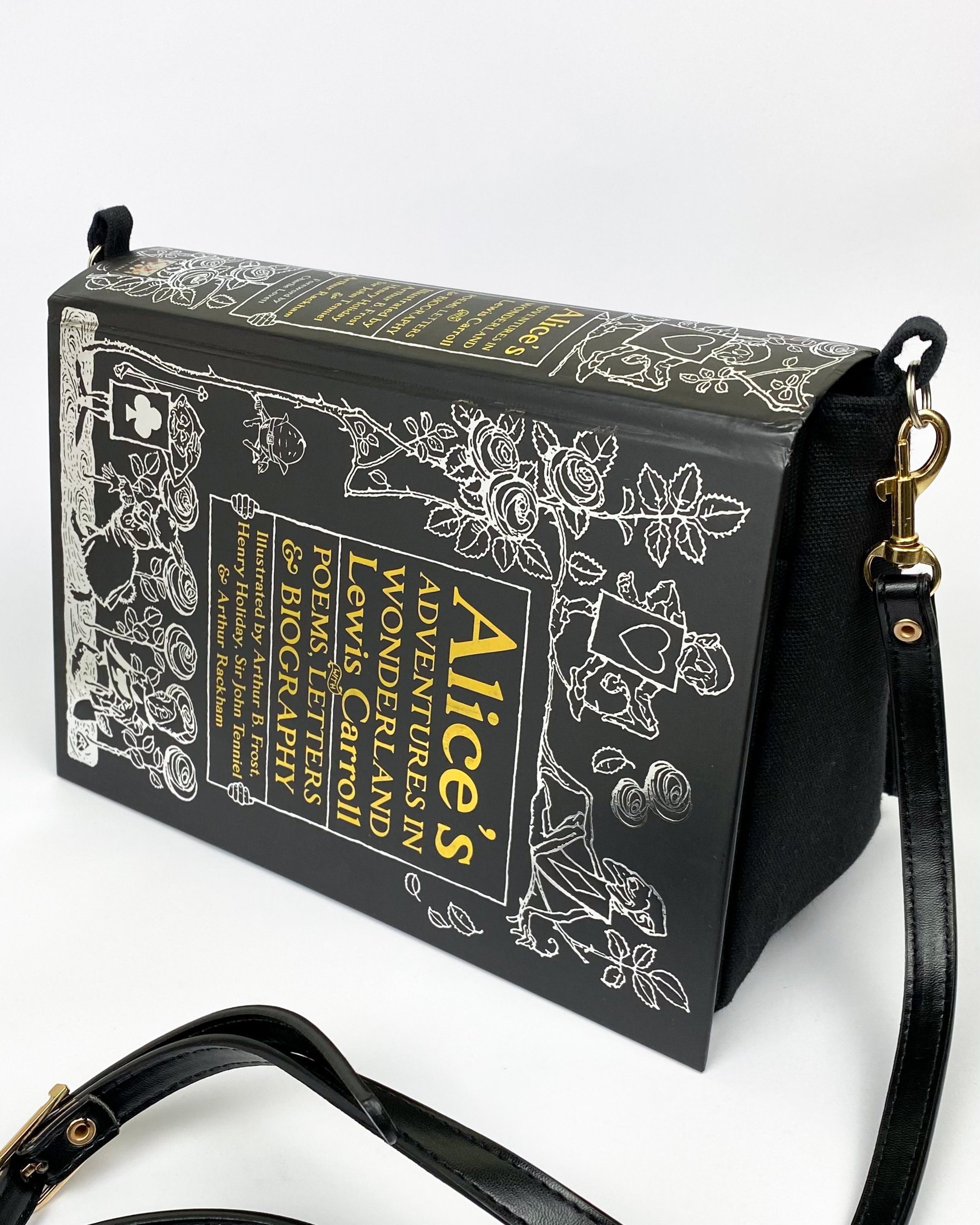 Details: green leatherbound book cover with red and white details. The inside bag has been sewn with sturdy black canvas fabric. The design includes a large front pocket, a 120cm black vegan leather adjustable strap, and a magnetic clasp closure. The strap is removable, so you can use it as a clutch as well!