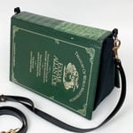 Details: dark green leather bound book cover with gold details. The inside bag has been sewn with sturdy black canvas fabric. The design includes a large front pocket, a 120cm black vegan leather adjustable strap and a magnetic clasp closure. The strap is removable, so you can use it as a clutch as well!