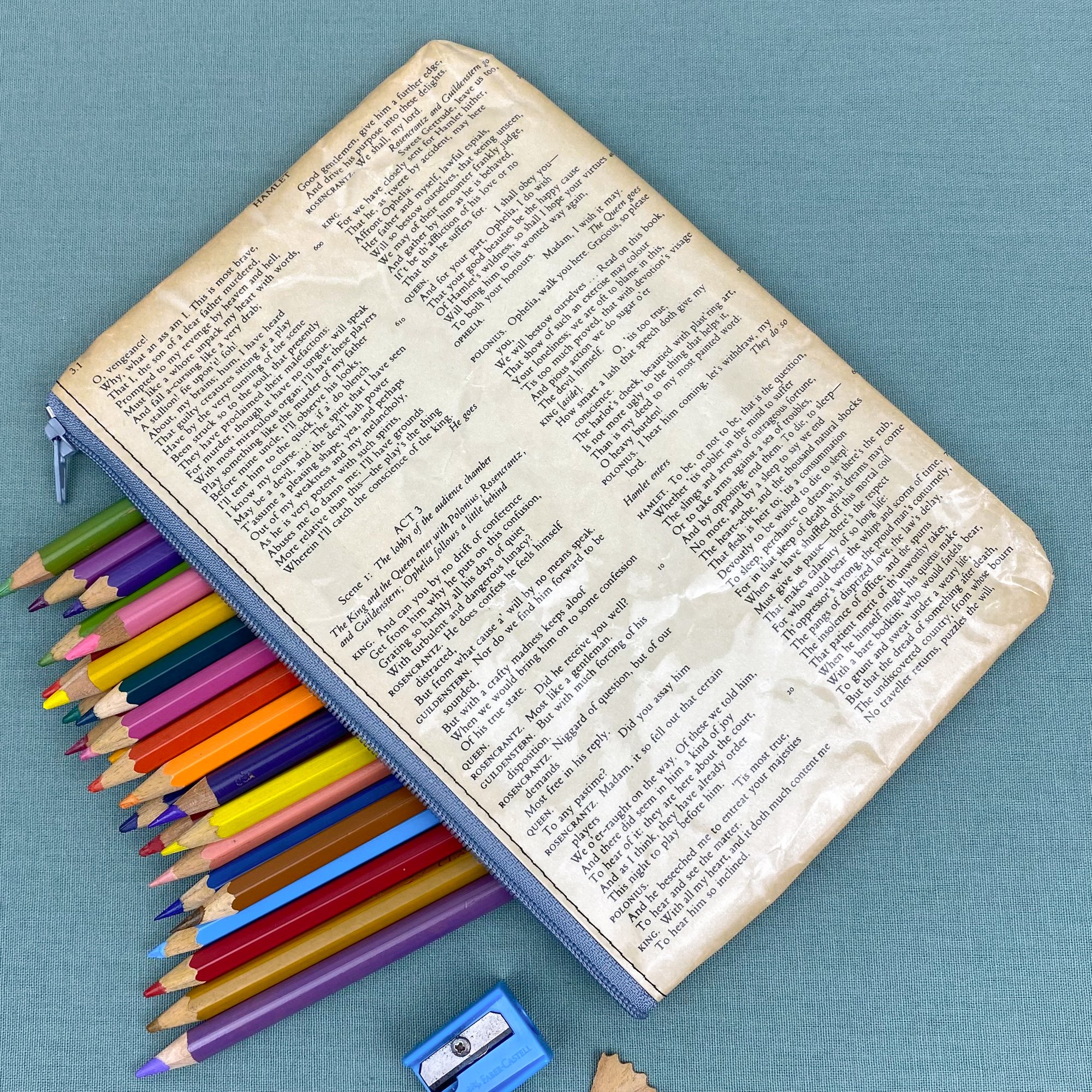 These are a versatile zipper pouch made from repurposed book pages. Use them as a pencil case, wallet, cosmetic bag, or for storing all the little bits and bobs that get lost in your bag.