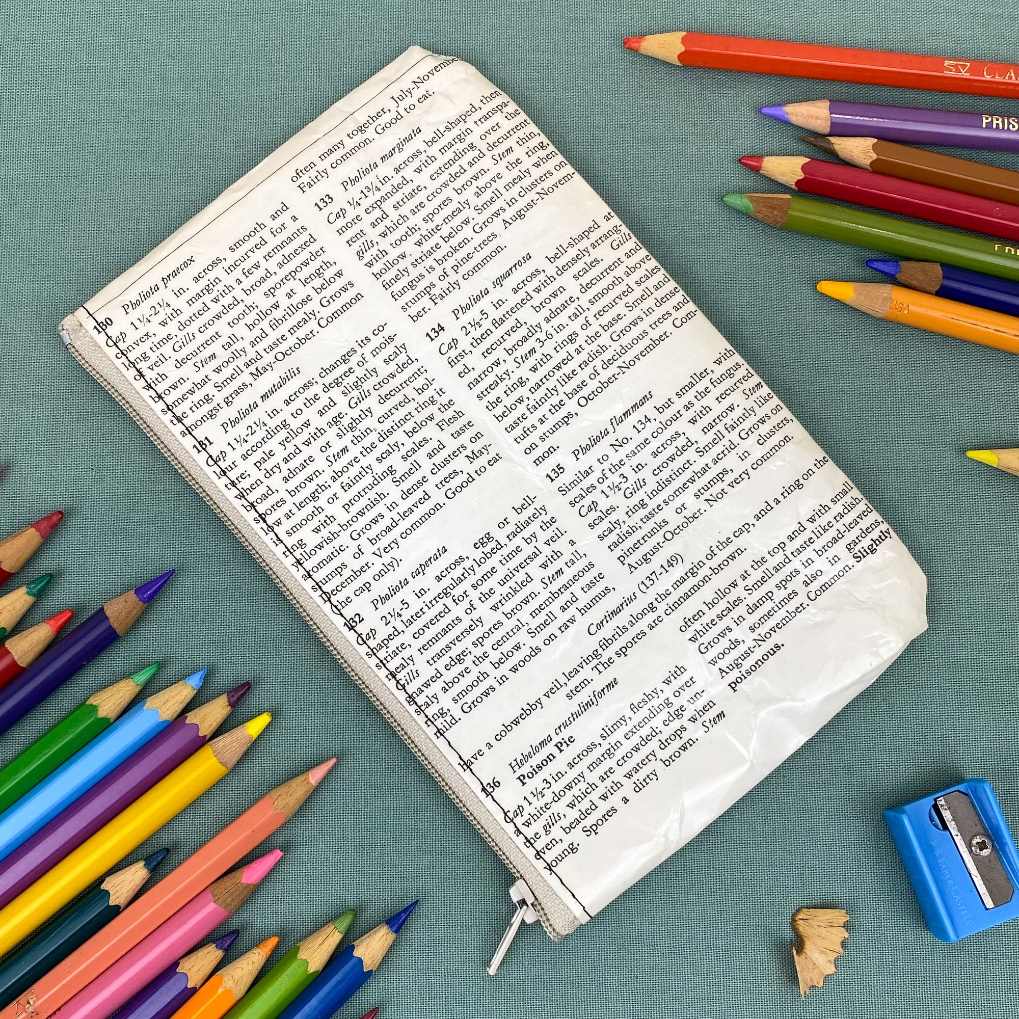 Both sides of the pages are covered in clear plastic for protection and durability. They can withstand the odd splash of water and can be wiped clean with a damp cloth, but they are not fully waterproof (where there’s stitching). You may notice the pages have a few crinkles, these occur during the making process when the finished pencil case is turned right side out, but I feel the crinkles add character! The pencil case is unlined so you can read the pages on the inside as well!