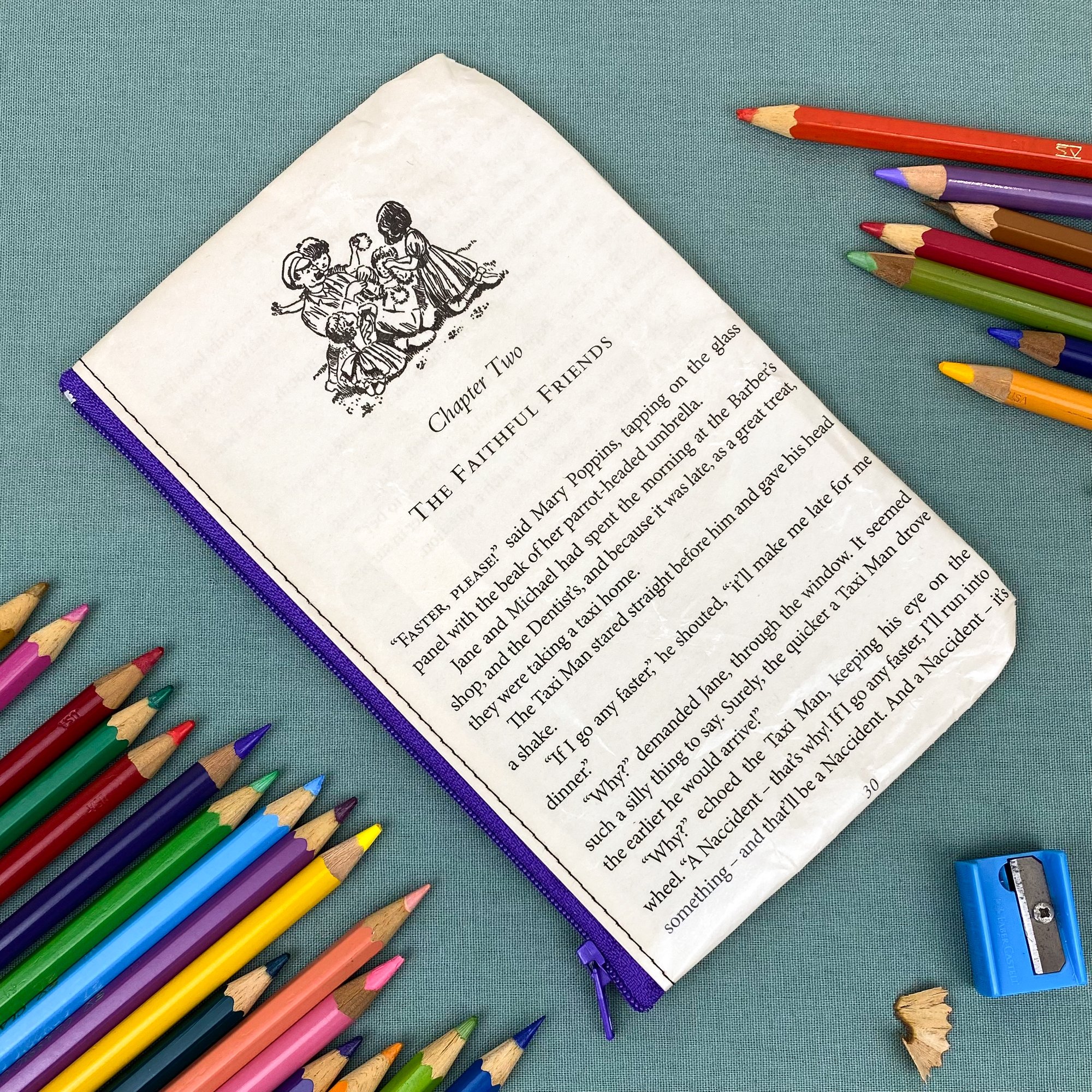 These are a versatile zipper pouch made from repurposed book pages. Use them as a pencil case, wallet, cosmetic bag, or for storing all the little bits and bobs that get lost in your bag.