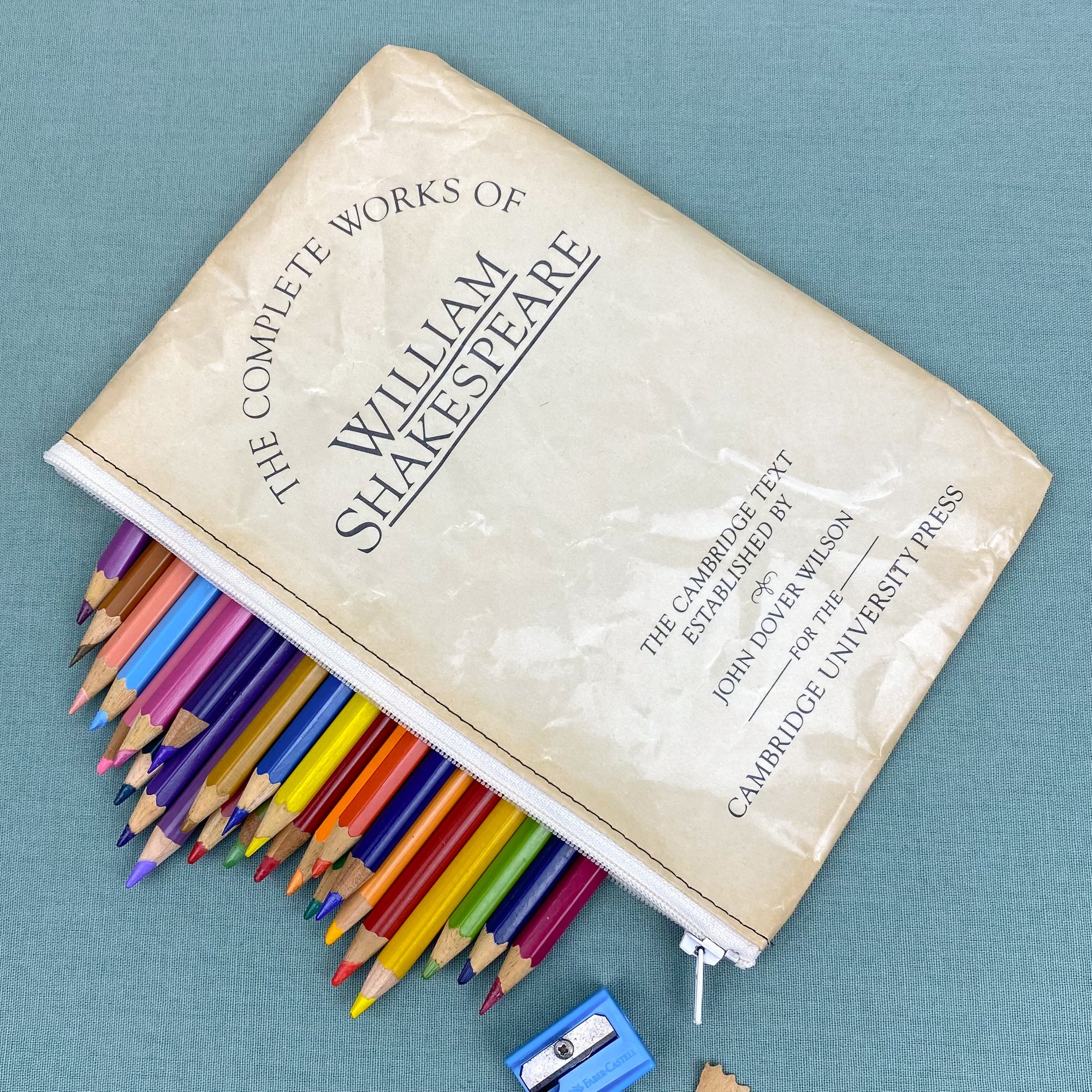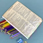 These are a versatile zipper pouch made from repurposed book pages. Use them as a pencil case, wallet, cosmetic bag, or for storing all the little bits and bobs that get lost in your bag.