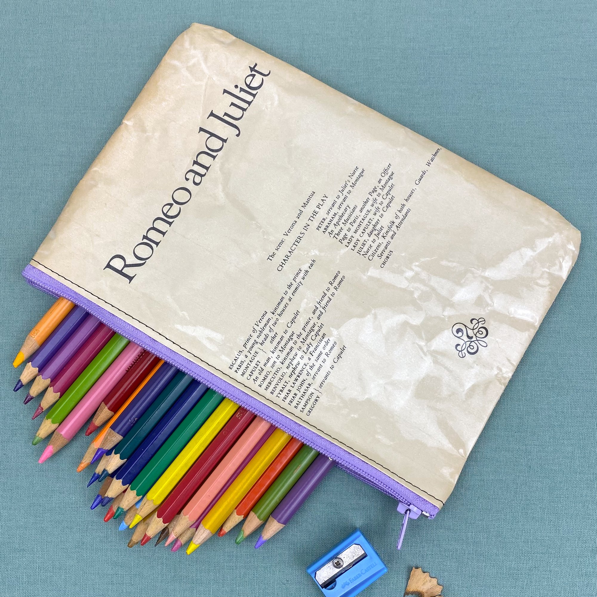 Both sides of the pages are covered in clear plastic for protection and durability. They can withstand the odd splash of water and can be wiped clean with a damp cloth, but they are not fully waterproof (where there’s stitching). You may notice the pages have a few crinkles, these occur during the making process when the finished pencil case is turned right side out, but I feel the crinkles add character! The pencil case is unlined so you can read the pages on the inside as well!
