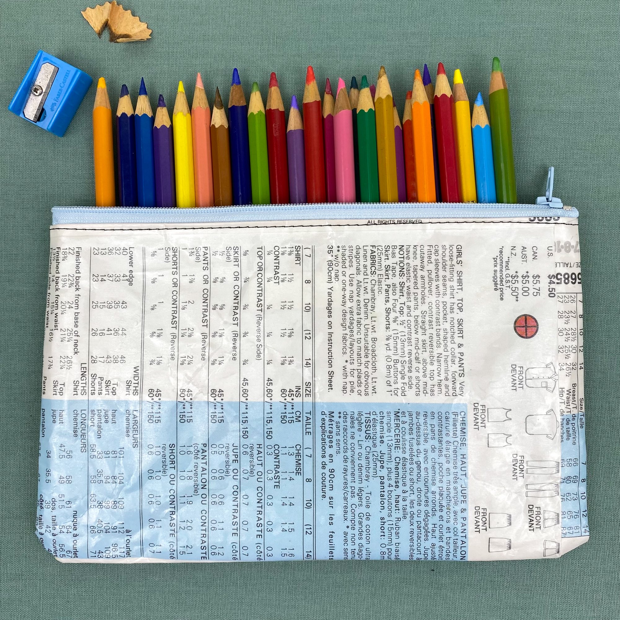 These are a versatile zipper pouch made from repurposed sewing patterns. Use them as a pencil case, wallet, cosmetic bag, or for storing all the little bits and bobs that get lost in your bag.