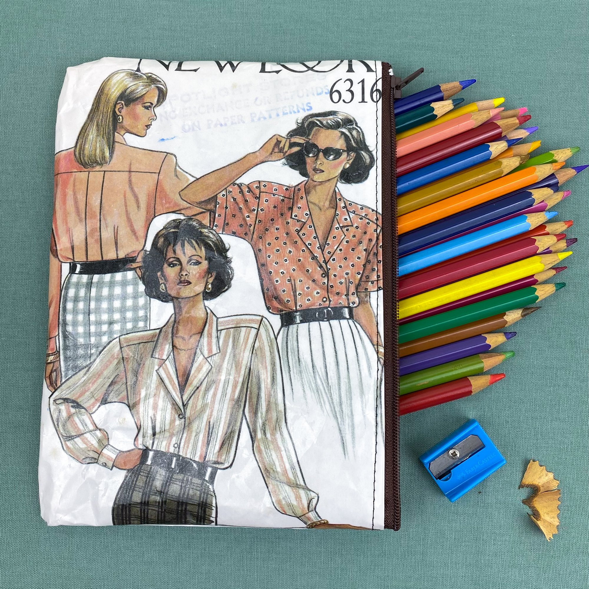These are a versatile zipper pouch made from repurposed sewing patterns. Use them as a pencil case, wallet, cosmetic bag, or for storing all the little bits and bobs that get lost in your bag.