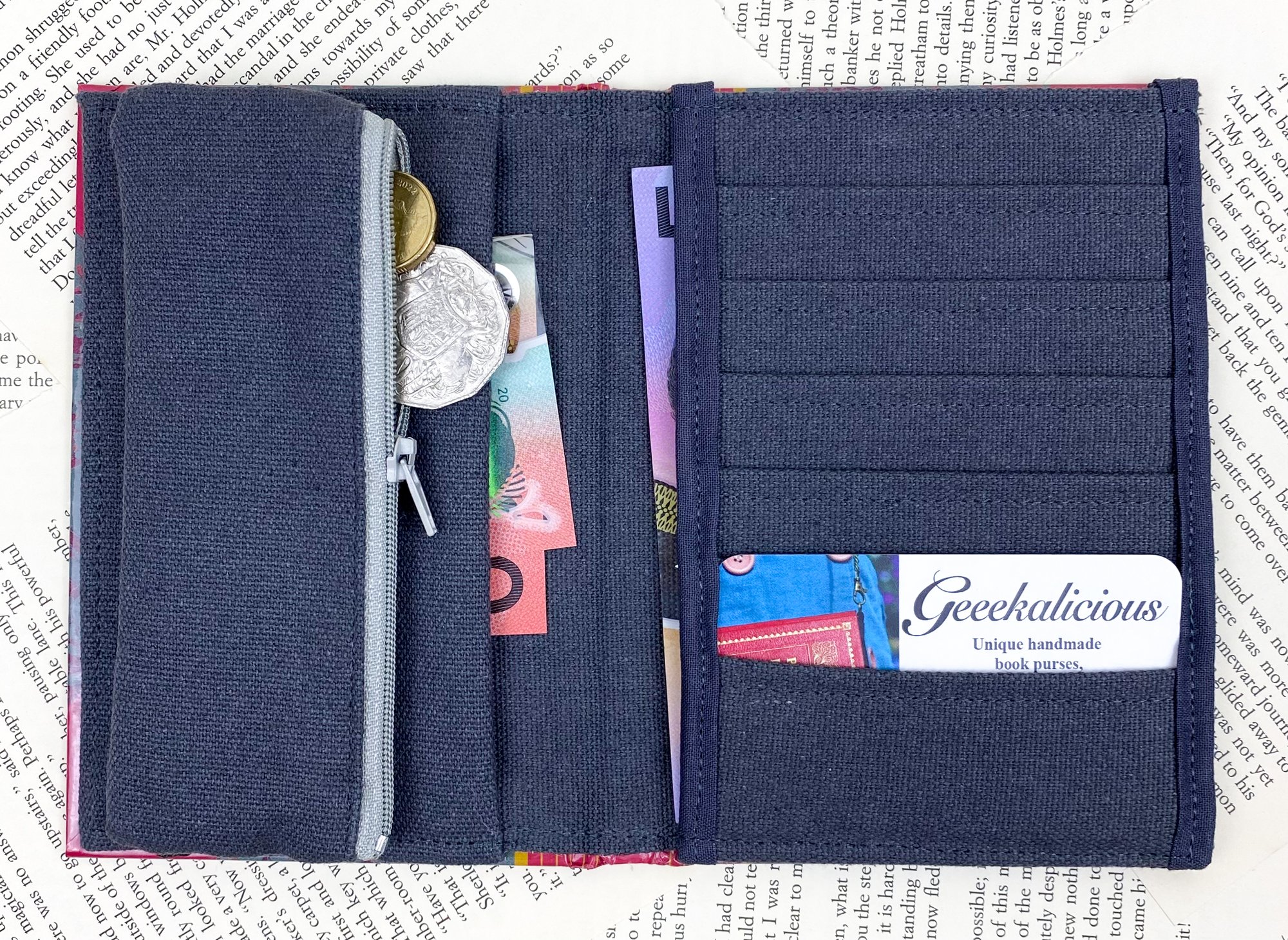 Details: dark grey canvas interior, a zippered pouch for coins, 2 pockets for cash and receipts, 6 card slots, elastic closure to keep everything safe and secured.