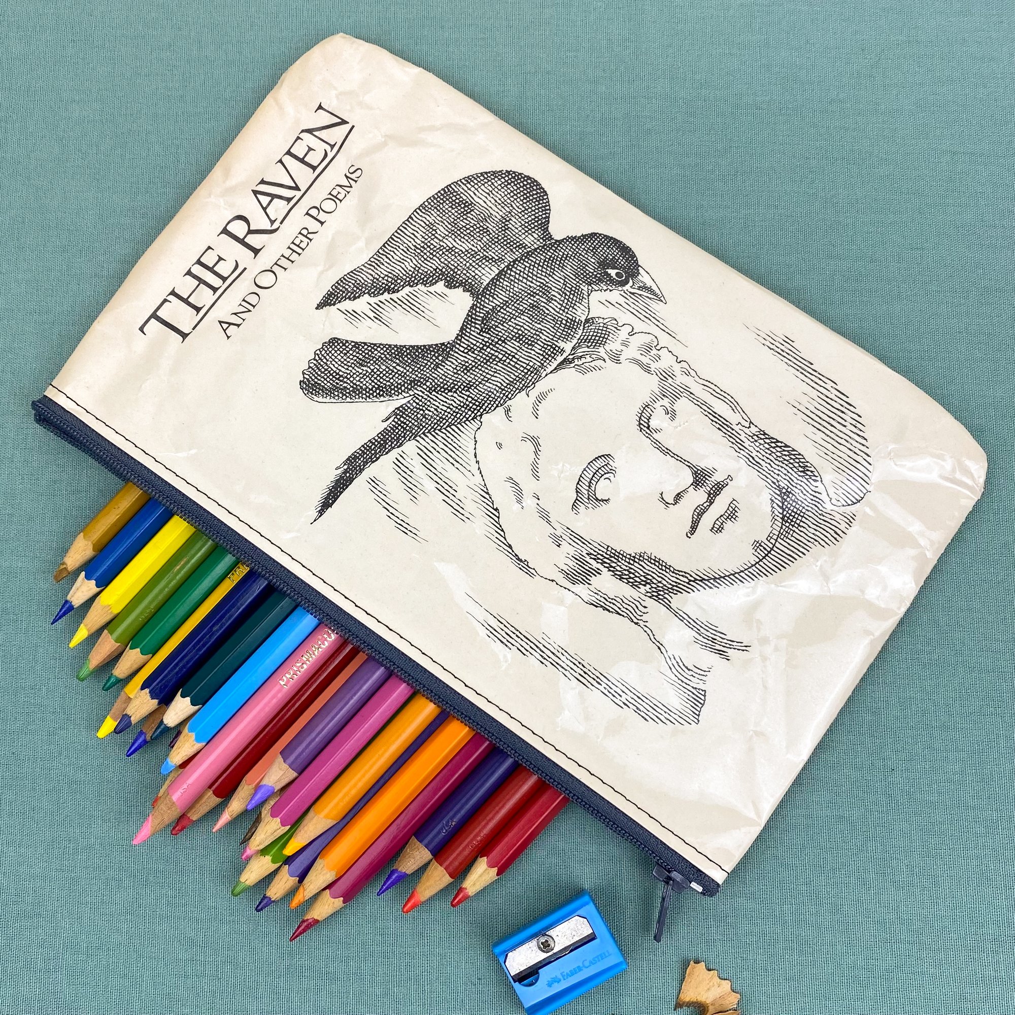 Both sides of the pages are covered in clear plastic for protection and durability. They can withstand the odd splash of water and can be wiped clean with a damp cloth, but they are not fully waterproof (where there’s stitching). You may notice the pages have a few crinkles, these occur during the making process when the finished pencil case is turned right side out, but I feel the crinkles add character! The pencil case is unlined so you can read the pages on the inside as well!