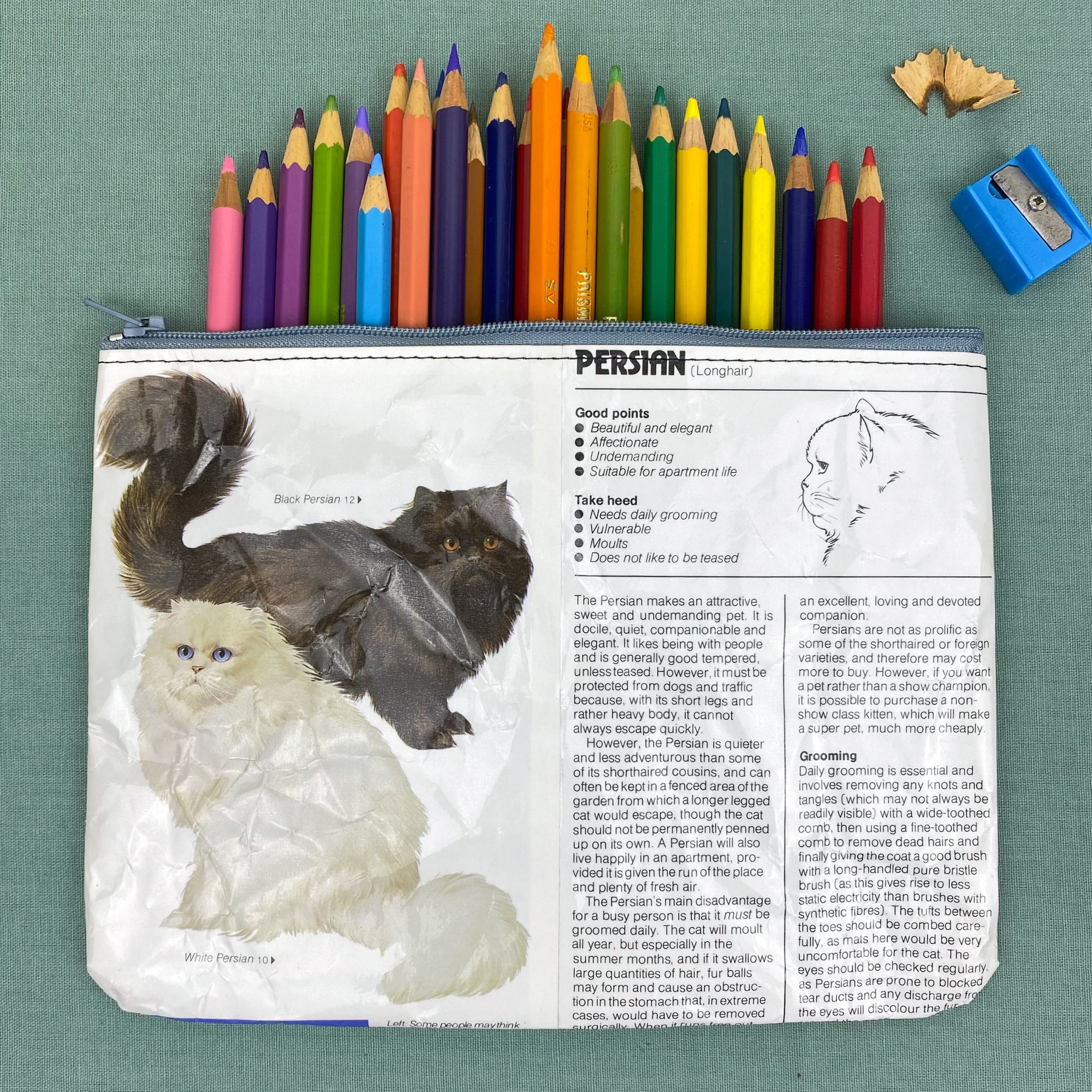 Both sides of the pages are covered in clear plastic for protection and durability. They can withstand the odd splash of water and can be wiped clean with a damp cloth, but they are not fully waterproof (where there’s stitching). You may notice the pages have a few crinkles, these occur during the making process when the finished pencil case is turned right side out, but I feel the crinkles add character! The pencil case is unlined so you can read the pages on the inside as well!